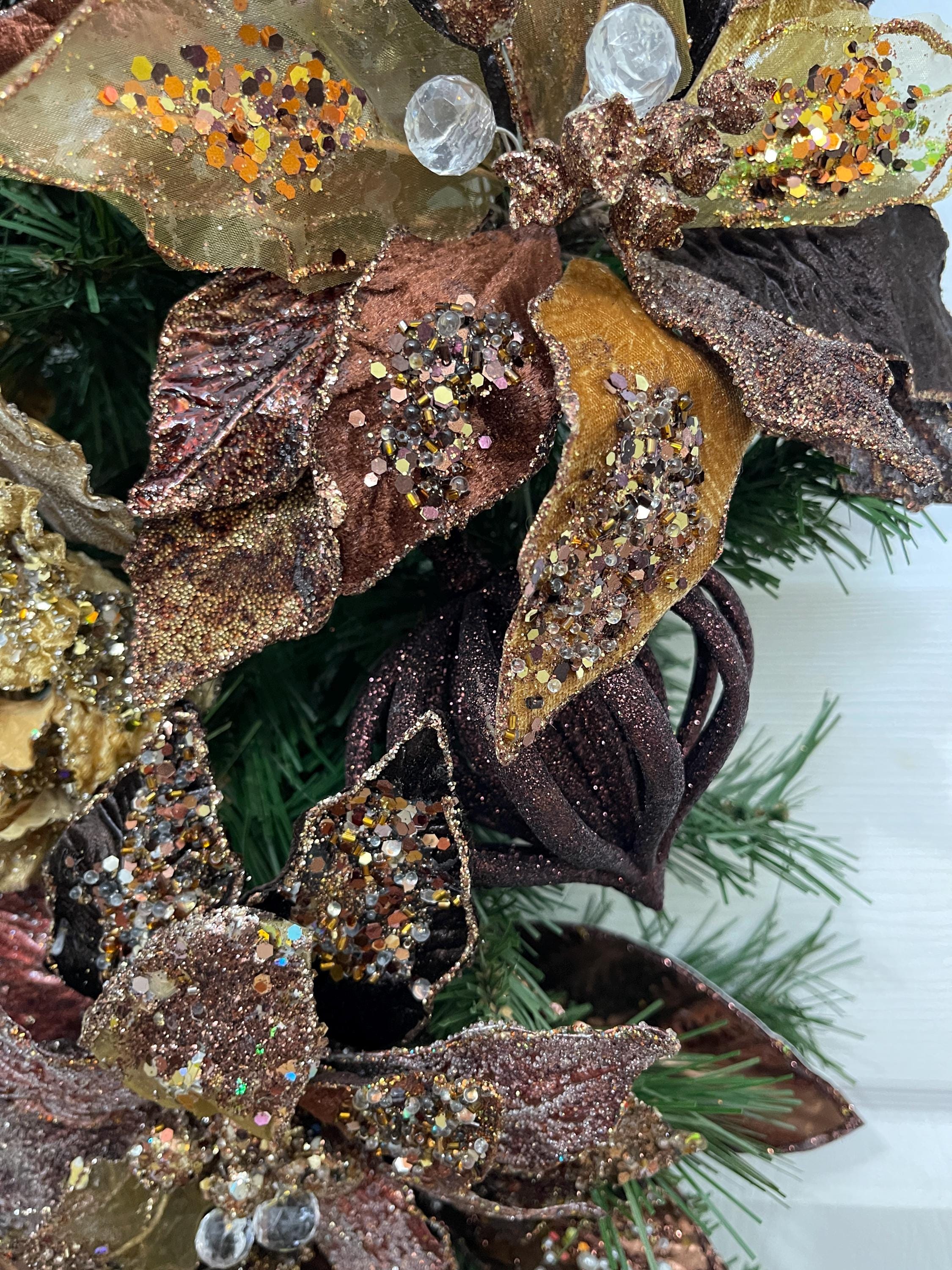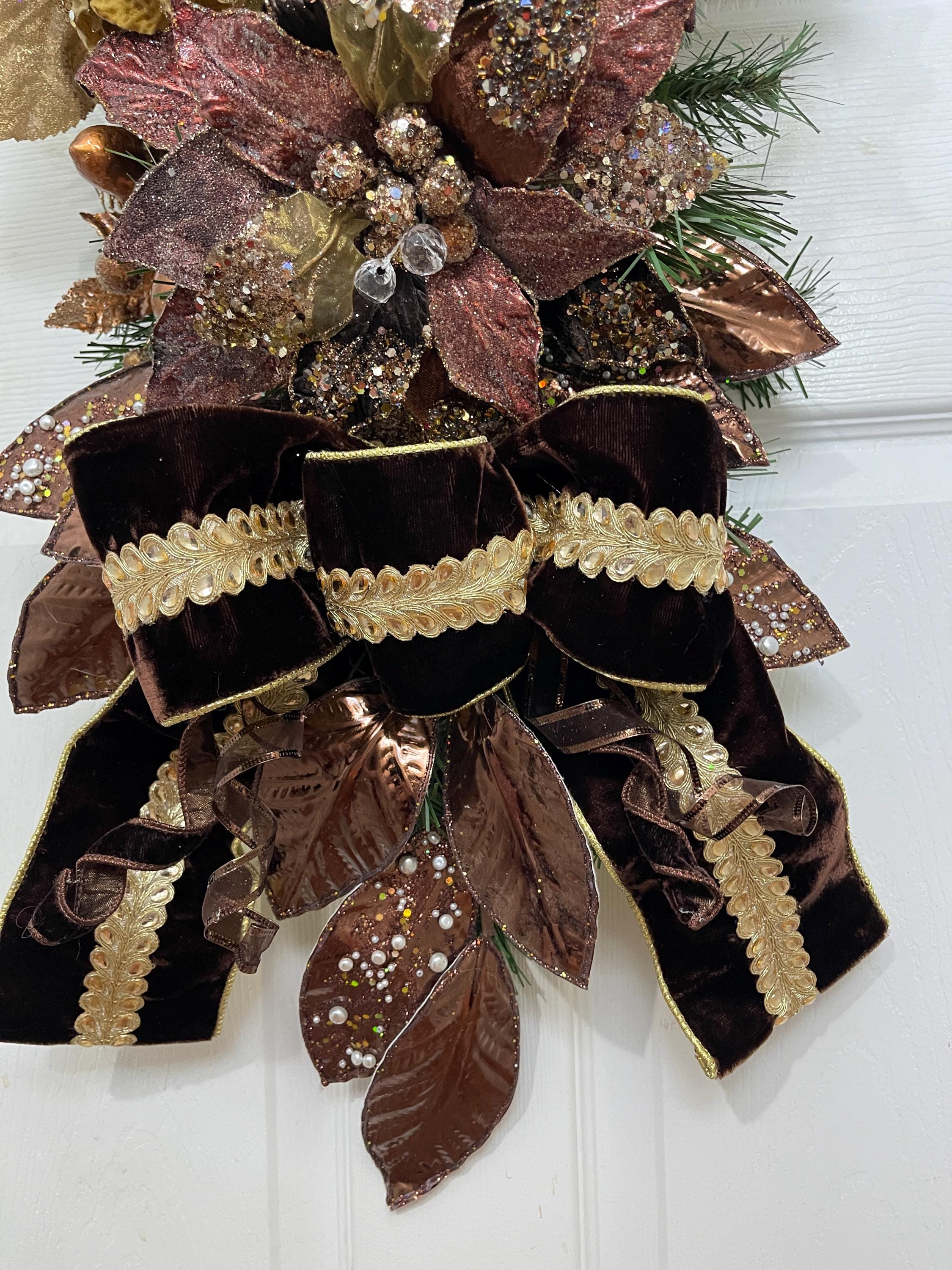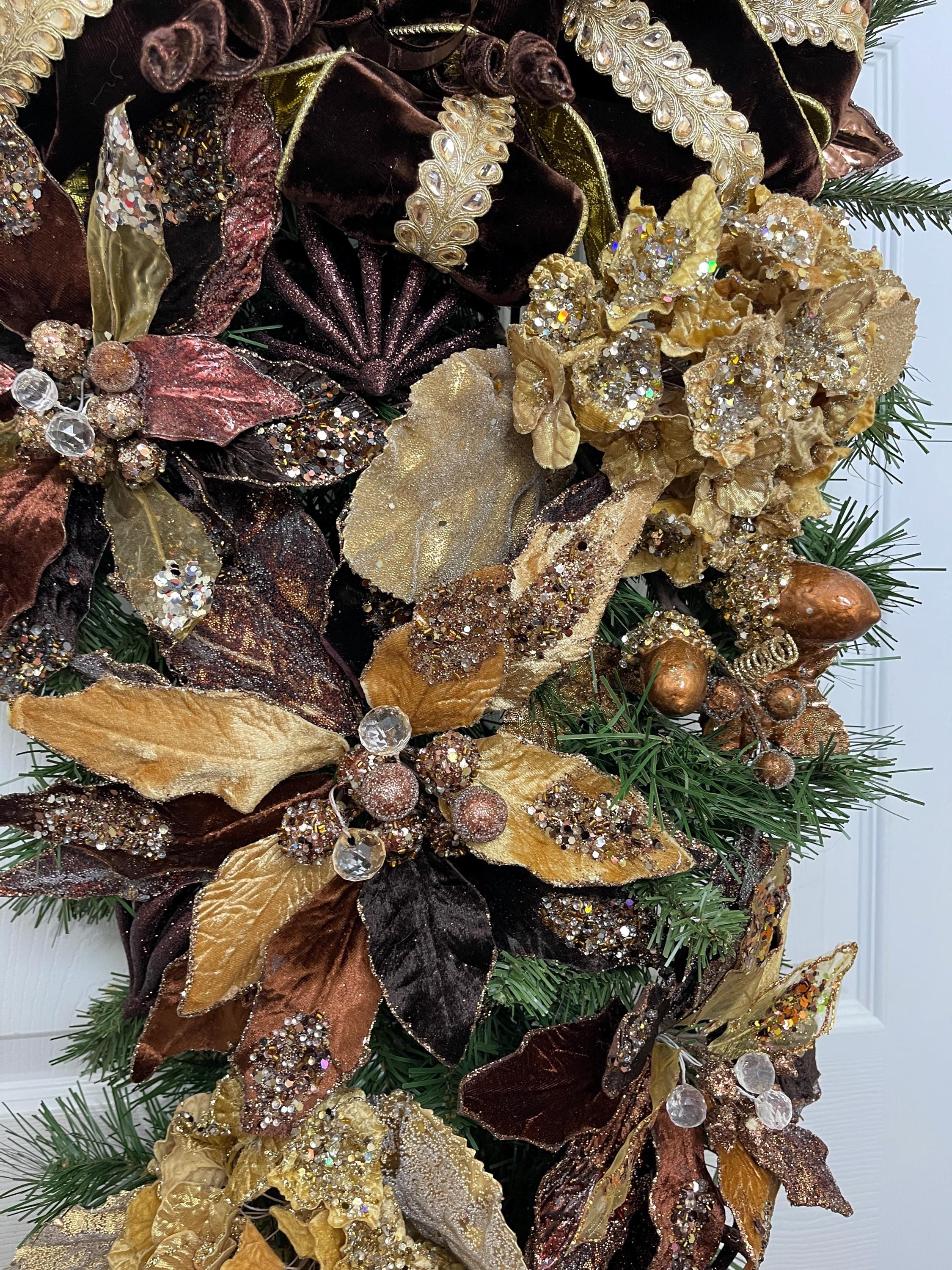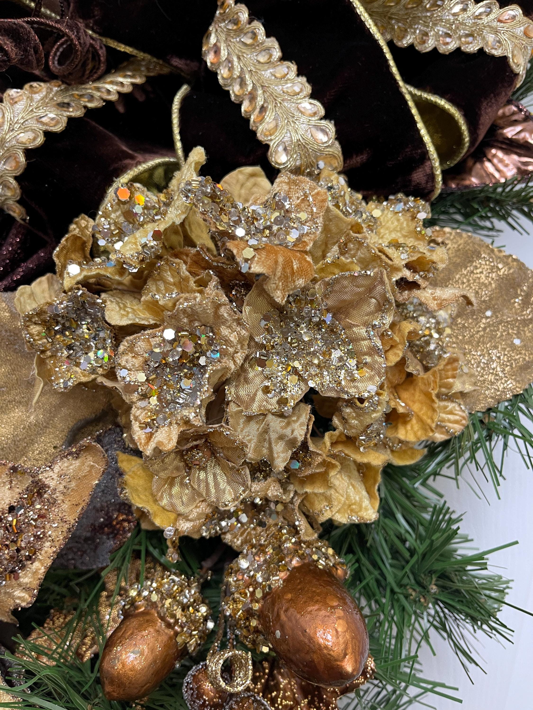 These swags are full of multicolor velvet laser beaded and bedazzled poinsettias in deep chocolate, gold, rust and copper surrounded by coordinating glittered hydrangeas in gold.