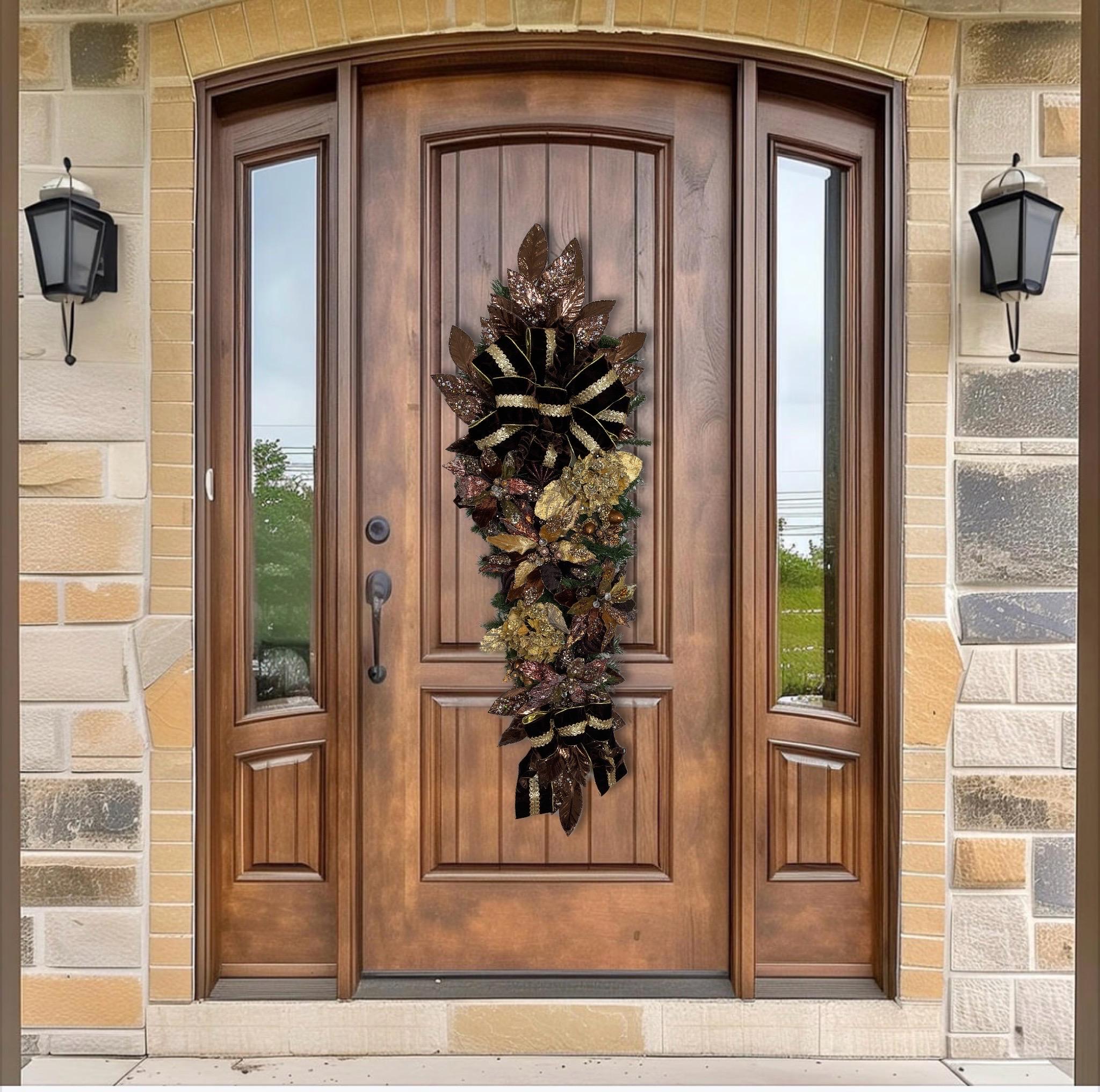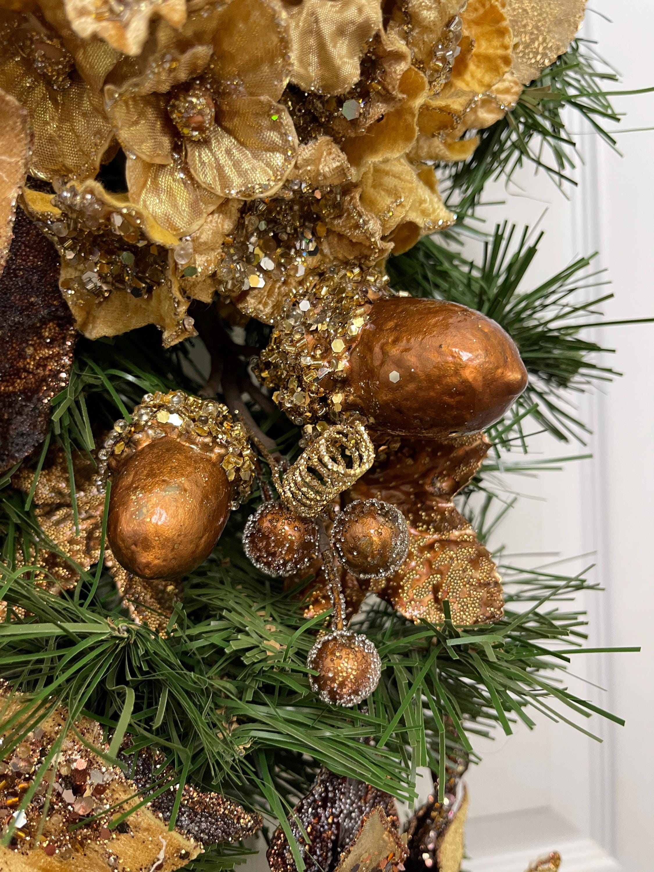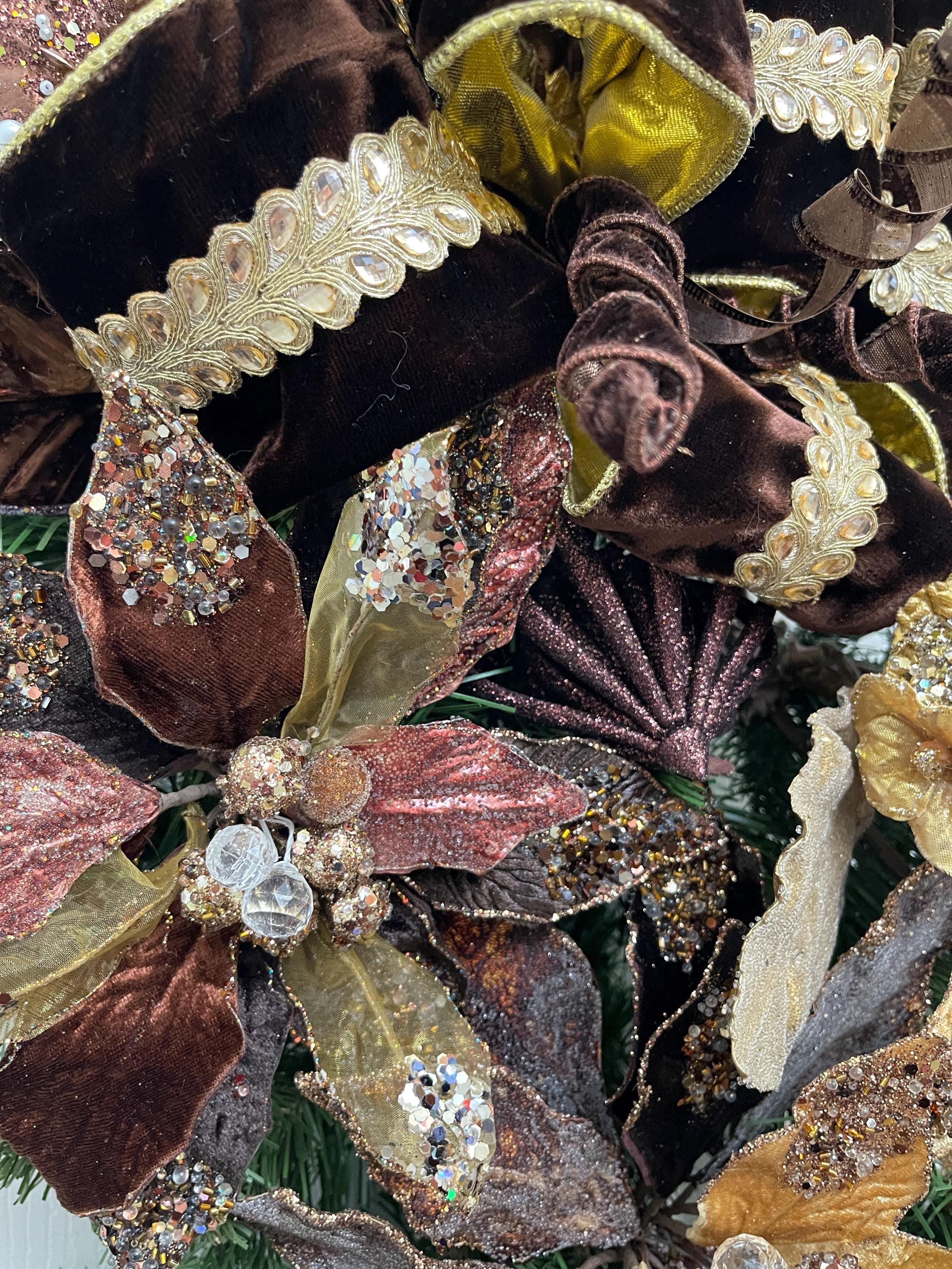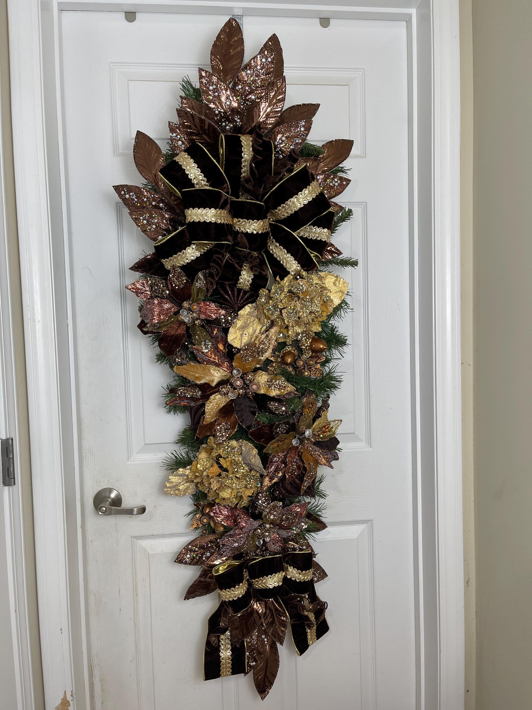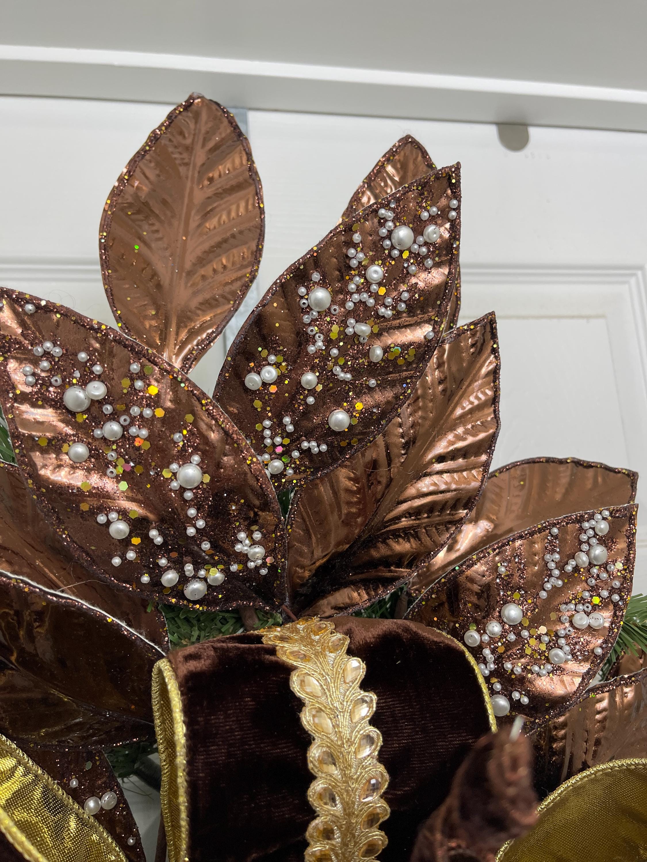 These swags are full of multicolor velvet laser beaded and bedazzled poinsettias in deep chocolate, gold, rust and copper surrounded by coordinating glittered hydrangeas in gold.