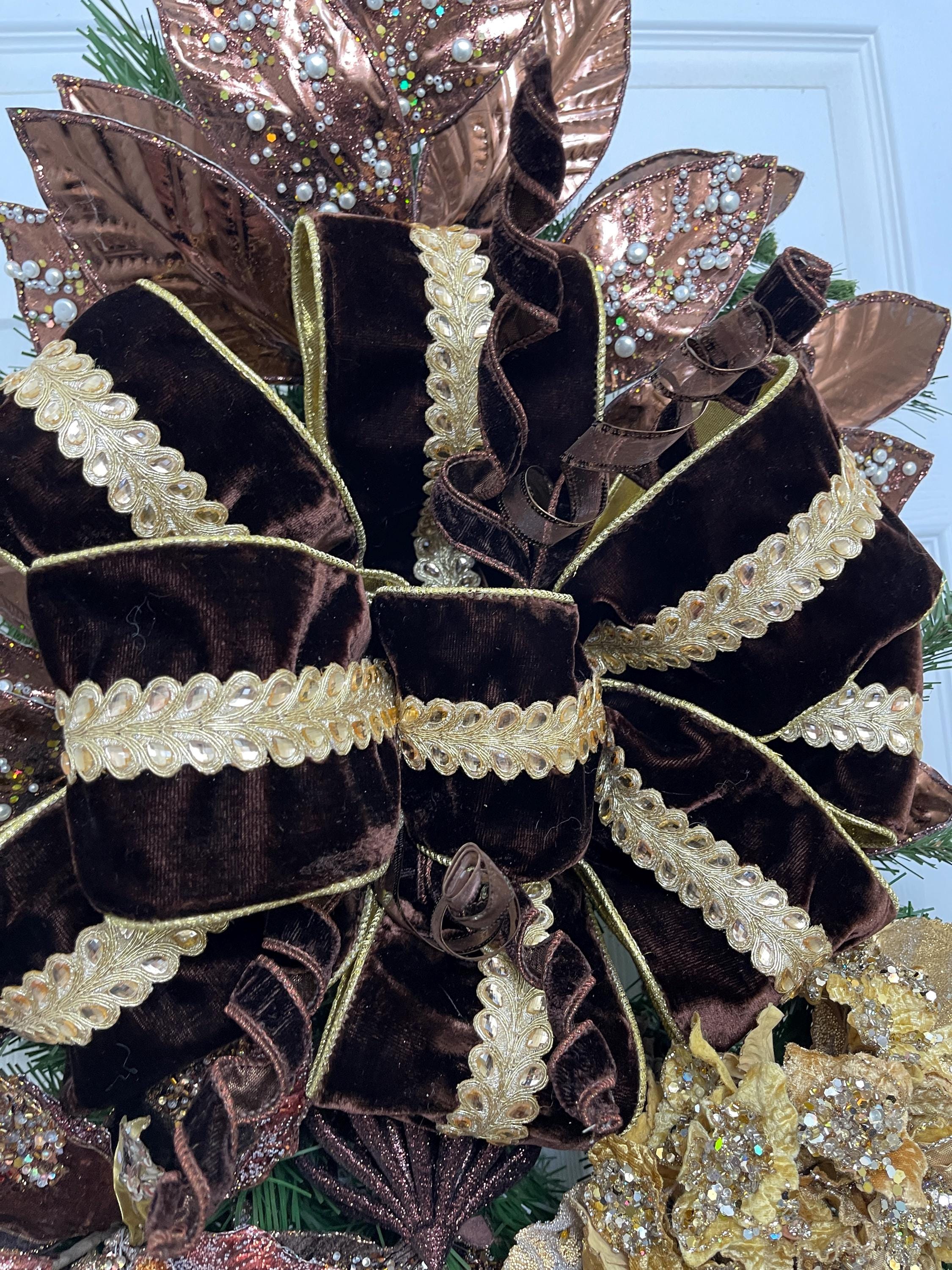 As always starting at the crown, you’re eyes will see the chrome copper sequin and pearl encrusted leaves surrounding an extra large decadent rich chocolate and gold braided velvet bow with amber jewels. Mini chocolate velvet and glittery shear ribbon tendrils for a touch of whimsy.